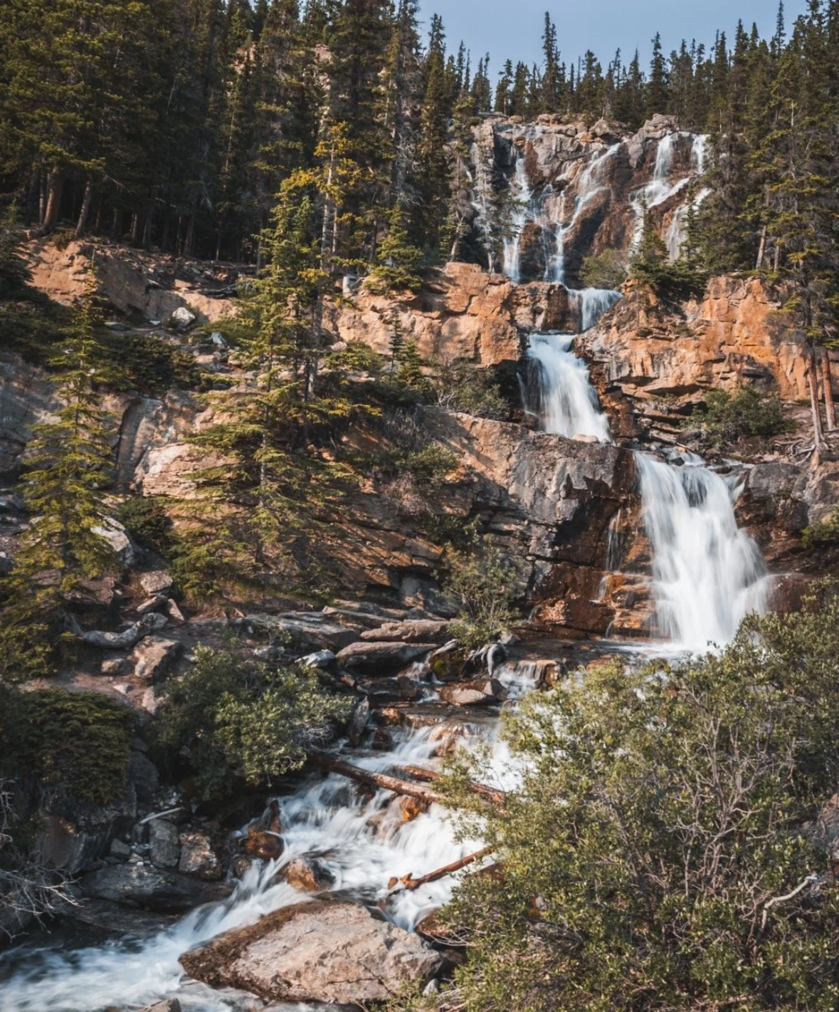 One of the strongest waterfalls in the Rockies. A short walk delivers an unforgettable view.